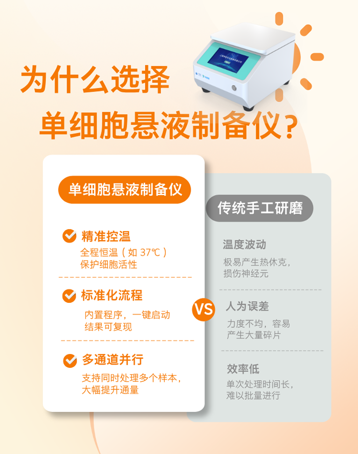 背景介紹:在神經(jīng)科學(xué)研究中,小鼠腦組織的解離一直是一道“硬骨頭”。傳統(tǒng)的手工研磨不僅耗時(shí)費(fèi)力,更常因機(jī)械剪切力過(guò)大或溫度控制不均,導(dǎo)致細(xì)胞受損、活率低下。今天,我們分享一款儀器——單細(xì)胞懸液制備儀,讓您的實(shí)驗(yàn)數(shù)據(jù)大大提升。