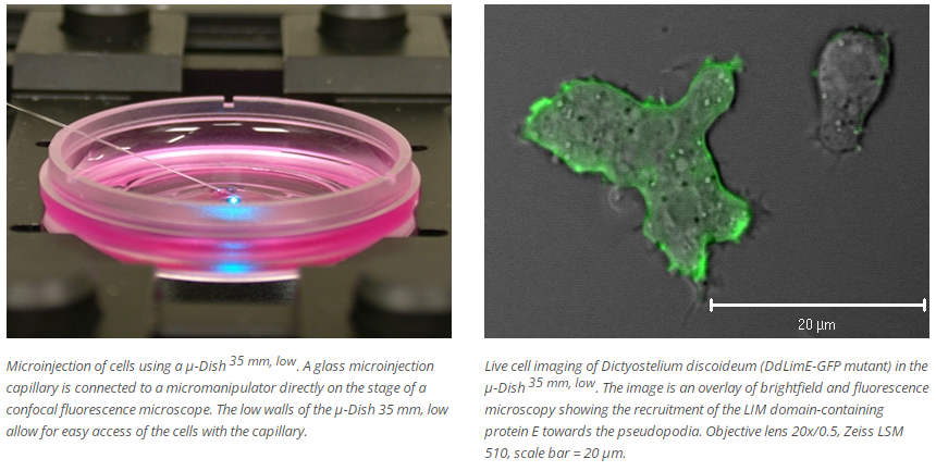 The ibidi μ-Dishes with low walls (i.e., μ-Dish 35 mm, low and μ-Dish 35 mm, low Glass Bottom) are perfectly suited for micromanipulation assays, such as intracellular injections, micropipette chemotaxis assays, or tissue treatment and microscopy. Due to the low walls of these μ-Dishes, instrumentation (e.g., electrodes) can be positioned exactly using a micromanipulator. The excellent optical quality makes the ibidi μ-Dishes ideally suited for single-cell handling and high-resolution live cell imaging. For all standard cell culture applications, we also offer the μ-Dish 35 mm, high product family with high walls.