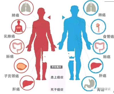 在我國,癌細胞頻繁“光顧”的人體組織,位居男性發(fā)病率前十位的分別是,肺、胃、肝、食管、大腸癌、膀胱、胰腺、腦、淋巴、腎;女性為肺、乳腺、大腸、胃、肝、食管、卵巢、宮頸、胰腺、腦?!翱梢哉f,這十種腫瘤占據(jù)了所有腫瘤類型的80%以上。