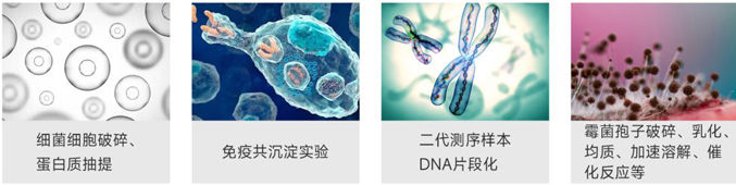 細(xì)菌細(xì)胞破碎、蛋白質(zhì)抽提、免疫共沉淀實(shí)驗(yàn)、二代測序樣本、霉菌孢子破碎/乳化、DNA片段化、均質(zhì)/加速溶解/催化反應(yīng)等