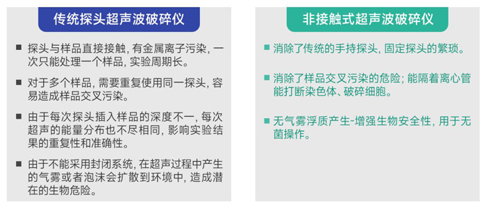 非接觸式樣品可在密閉容器下進(jìn)行破碎,不產(chǎn)生感染性飛霧,超聲探頭與樣品不接觸,避免交叉污染。對于每天要處理多個(gè)樣品或者貴重樣品的實(shí)驗(yàn)室,非接觸超聲波DNA破碎儀具有處理高通量,樣本低損耗無交叉污染等優(yōu)勢。逐漸成為ChIP(染色質(zhì)免疫共沉淀)和DNA剪切研究平臺(tái)不可缺少的標(biāo)準(zhǔn)化工具。